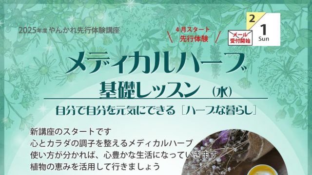 お知らせ 2025年度やんかれ先行体験講座|メディカルハーブ基礎レッスン|2026年3月4日(水) 2026年1月10日 サイト管理者 http://yankare.com/wp-content/uploads/2019/08/logo2019-1-1.png やんかれ