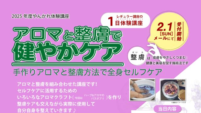 お知らせ 2025年度やんかれ体験講座|アロマと整膚で健やかケア|2026年3月18日(水) 2026年1月10日 サイト管理者 http://yankare.com/wp-content/uploads/2019/08/logo2019-1-1.png やんかれ