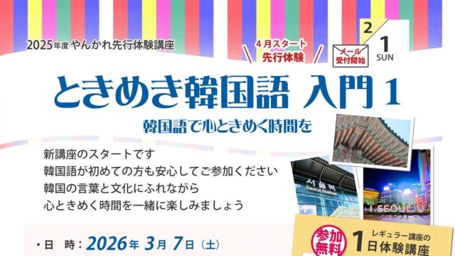 お知らせ 2025年度やんかれ先行体験講座|ときめき韓国語入門1|2026年3月7日(土) 2026年1月10日 サイト管理者 http://yankare.com/wp-content/uploads/2019/08/logo2019-1-1.png やんかれ