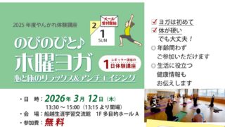 お知らせ 2025年度やんかれ体験講座|呼吸が深まるほぐしヨガ|2026年3月11日(水) 2026年1月10日 サイト管理者 http://yankare.com/wp-content/uploads/2019/08/logo2019-1-1.png やんかれ