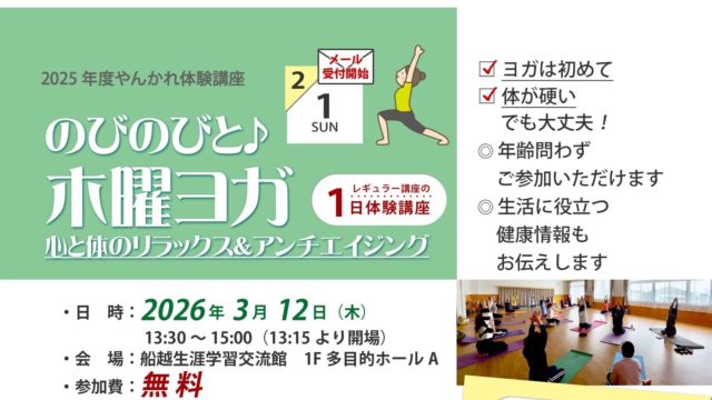 お知らせ 2025年度やんかれ体験講座|のびのびと木曜ヨガ|2026年3月12日(木) 2026年1月10日 サイト管理者 http://yankare.com/wp-content/uploads/2019/08/logo2019-1-1.png やんかれ