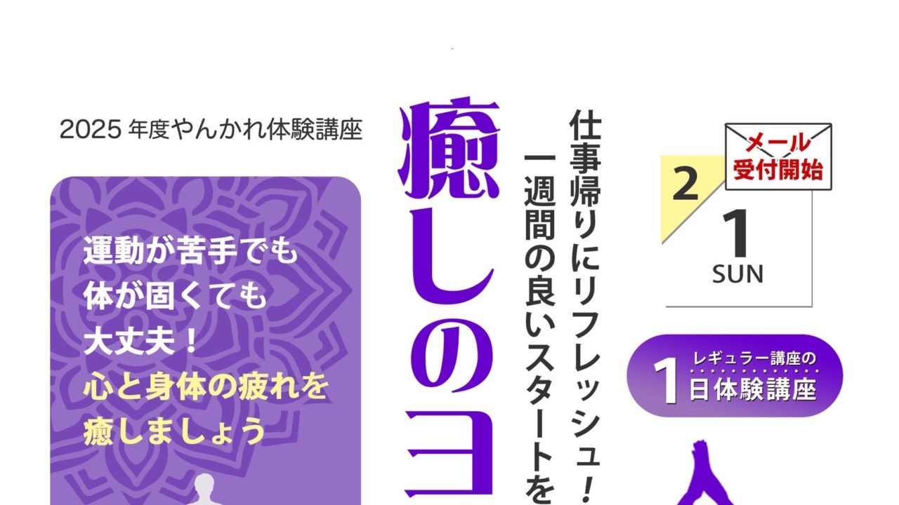 お知らせ 2025年度やんかれ体験講座|呼吸が深まるほぐしヨガ|2026年3月11日(水) 2026年1月10日 サイト管理者 http://yankare.com/wp-content/uploads/2019/08/logo2019-1-1.png やんかれ